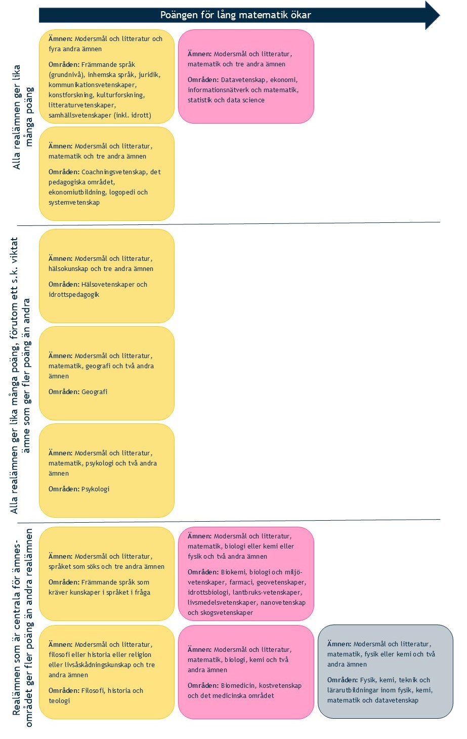 Ämnesrealerna poängsätts på tre olika sätt beroende på till vilket ämnesområde man söker:
